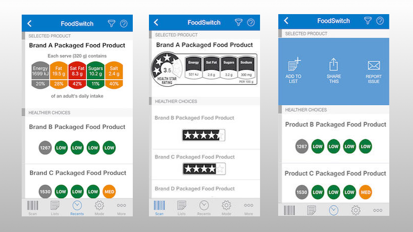 FoodSwitch helps you make healthier choices when shopping at the supermarket. FoodSwitch scans the barcode of a food packet and the nutrition information is highlighted in green, yellow or red. This gives you an idea of how healthy that food might be. It lists products in the same category that are healthier choices, with lower levels of fat, saturated fat, sugar and salt 'GlutenSwitch' option will tell you if the product is gluten-free and will also list a gluten-free alternative, if there is one available.