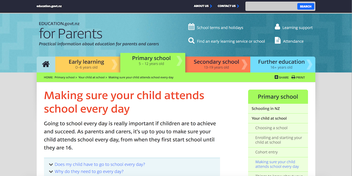 In New Zealand, going to school every day is really important if children are to achieve and succeed. As parents and carers, it's up to you to make sure your child attends school every day, from when they first start school until they are 16.